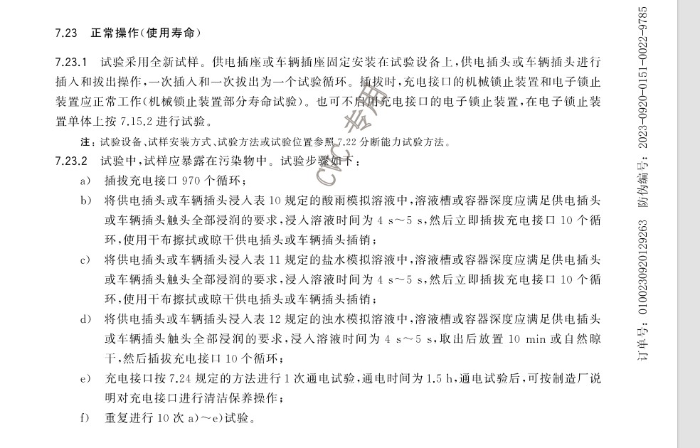 1. GB/T20234.1-2023《電動(dòng)汽車(chē)傳導(dǎo)充電用連接裝置 第1部分:通用要求》標(biāo)準(zhǔn)中第7.23正常操作(使用壽命)條款要求;