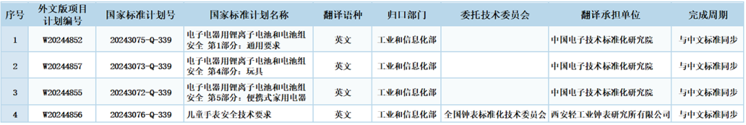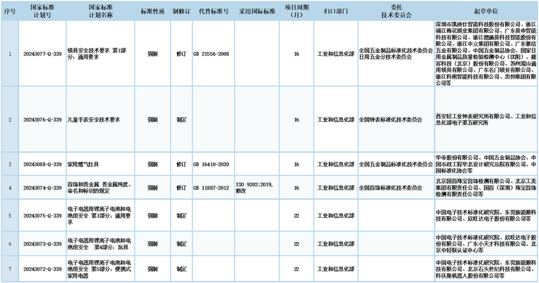近日,國家標準化管理委員會發布《兒童手表安全技術要求》等18項強制性國家標準制修訂計劃及7項強制性國家標準外文版計劃,其中包括《兒童手表安全技術要求》《鎖具安全技術要求 第1部分:通用要求》等7項輕工領域強制性國家標準計劃,以及《兒童手表安全技術要求》《電子電器用鋰離子電池和電池組安全 第1部分:通用要求》等4項輕工領域相關標準外文版計劃(外文版計劃的語種均為英文),具體如下。