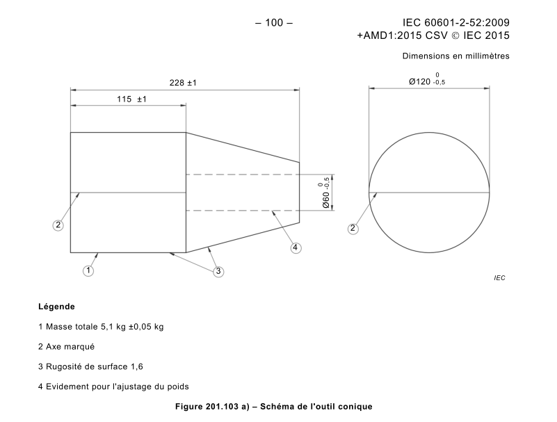 1.1 來自人體重量的動載荷測試:人體重量模型的頂槽是有木質、金屬或類似材料制成。槽預期用于裝載適當的人體重量,多采用高密度材料(例如鉛)。底座部分采用泡沫材料。泡沫材料是圓柱形而不是球形。人體重量模型具體尺寸要求詳見GB 9706.1-2020中圖33。