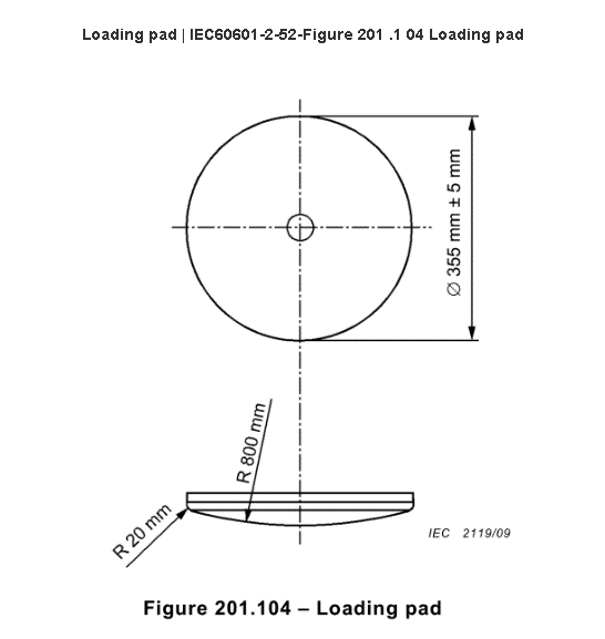 1.1 床墊支承臺動態耐久性測試: 調節醫用電動床至水平狀態試驗高度,在標準要求的位置通過配套的負荷墊施加一個固定載荷,載荷應至少覆蓋0~2000N范圍,次數至少0~10000次可調。負荷墊需符合及未來將發布的現行標準代替版YY 9606.252-20XX IEC 60601-2-52國內轉化)標準要求,總直徑為350mm的剛性物體,表面是一個曲率半徑為800mm的凸形球,前緣半徑為20mm。(見YY 0571-2013中圖BB.3及YY 9606.252-20XX新版標準中圖201.104)